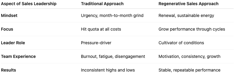 It’s the application of regenerative psychology to sales leadership, shifting from urgency-driven pressure to sustainable cycles of performance.